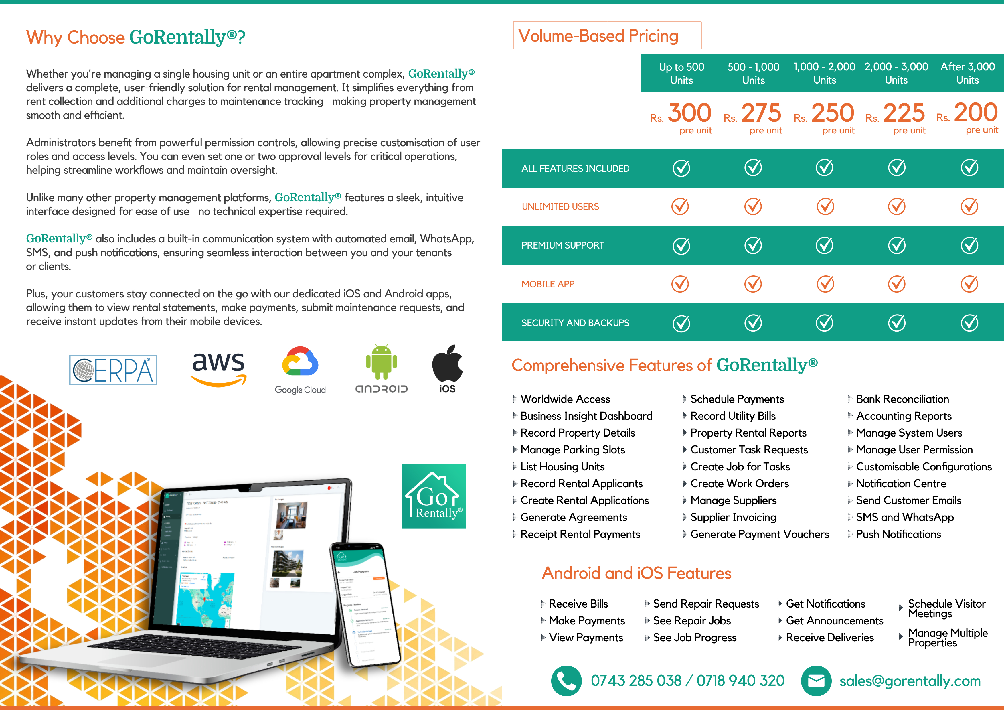 GoRentally® for Rental Properties is a comprehensive solution designed to sopports every aspect of property rental management. From tenant onboarding and lease tracking to automated billing and payment reminders, the system simplifies daily operations and improves tenant satisfaction. Landlords and property managers can effortlessly manage multiple units, monitor occupancy rates, and stay on top of contract renewals-all from a single, user-friendly dashboard.